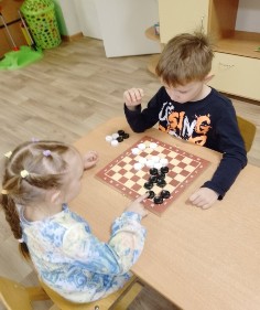 31 октября в детском саду прошел тематический день «День шашек». «Шашки» - одна из самых интеллектуальных игр! История возникновения этой игры имеет много версий, одна из них гласит, что ее придумал греческий воин Паламид, во время осады города Трои. Популярны шашки были и на Руси, привезли ее в нашу страну викинги (так гласит предание), с удовольствием осваивали ее русские богатыри и князья. В наши дни в эту игру играют и большие и маленькие. Большая часть детей в дошкольном возрасте по своей природе очень подвижна и активна, им трудно сосредоточить свое внимание на чем-либо продолжительное время, а эта волшебная игра ненавязчиво формирует такое качество, как усидчивость, развивает логическое мышление, пространственное воображение, память и внимание, что очень важно для подготовки к школе. Так же игра в шашки воспитывает в детях такие немаловажные для их будущей жизни качества, как умение самостоятельно думать и нести ответственность за принятое решение, адекватно относиться к неудачам и поражениям.