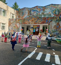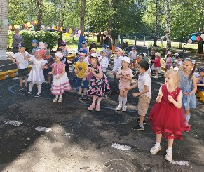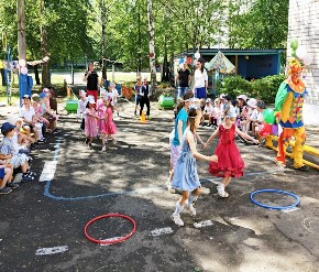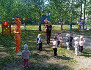 В первый день лета отмечается международный праздник – День защиты детей. Радостно, звонко, тепло и красочно прошёл главный праздник детства в детском саду. Мы постарались в этот день создать праздничную атмосферу и порадовать детей весёлыми играми, песнями, танцами. В гости к детям пришел клоун. Воспитанники вместе с клоуном участвовали в играх, пели песни о дружбе, танцевали. Закончился праздник зажигательным танцем и рисованием мелками на асфальте.